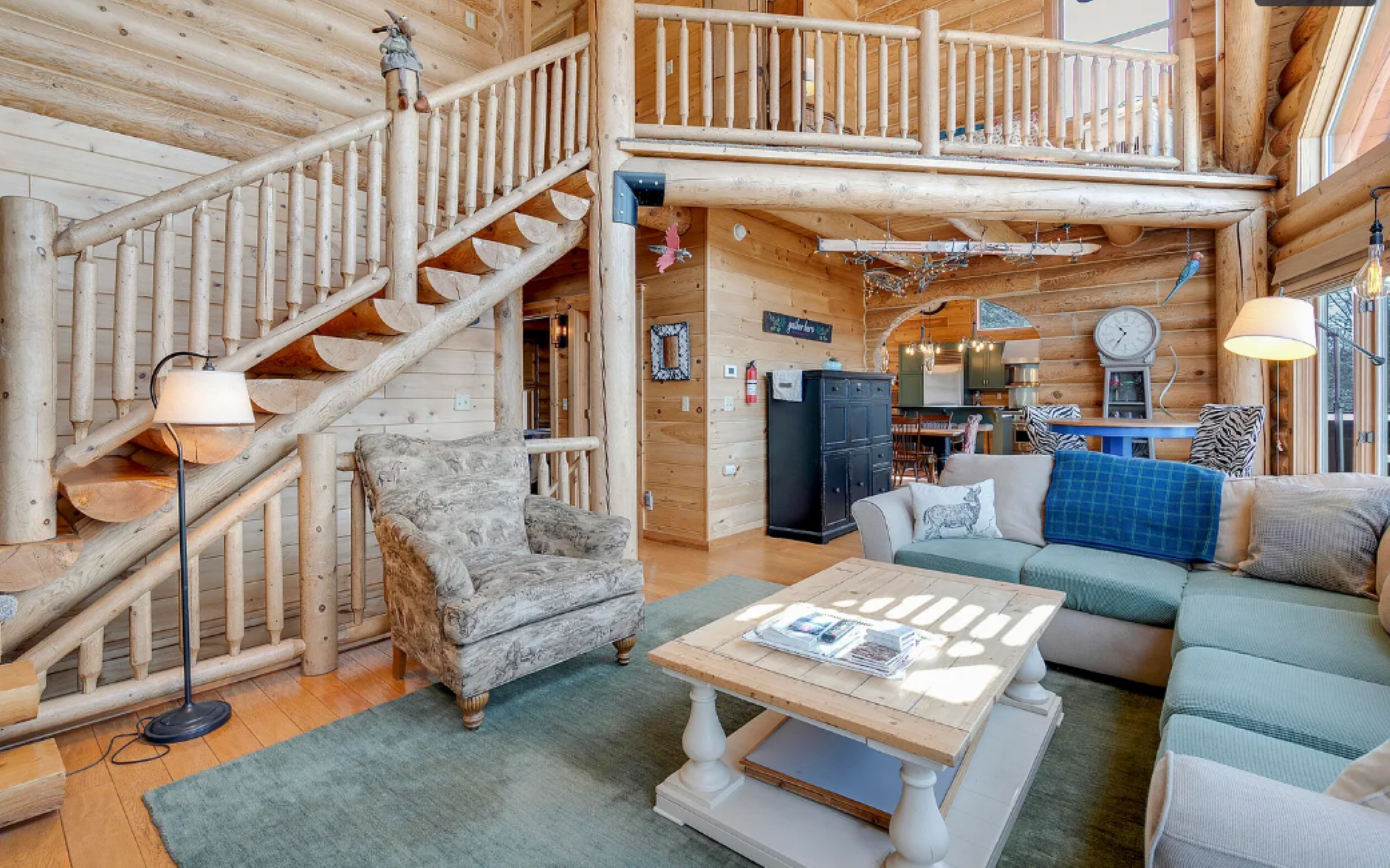 • Relax in the spacious living room, anchored by a cozy wood-burning fireplace. A Smart TV invites you to unwind after an active day on the slopes or trails. Large windows frame panoramic mountain views and flood the space with natural light, creating an inviting and scenic retreat.