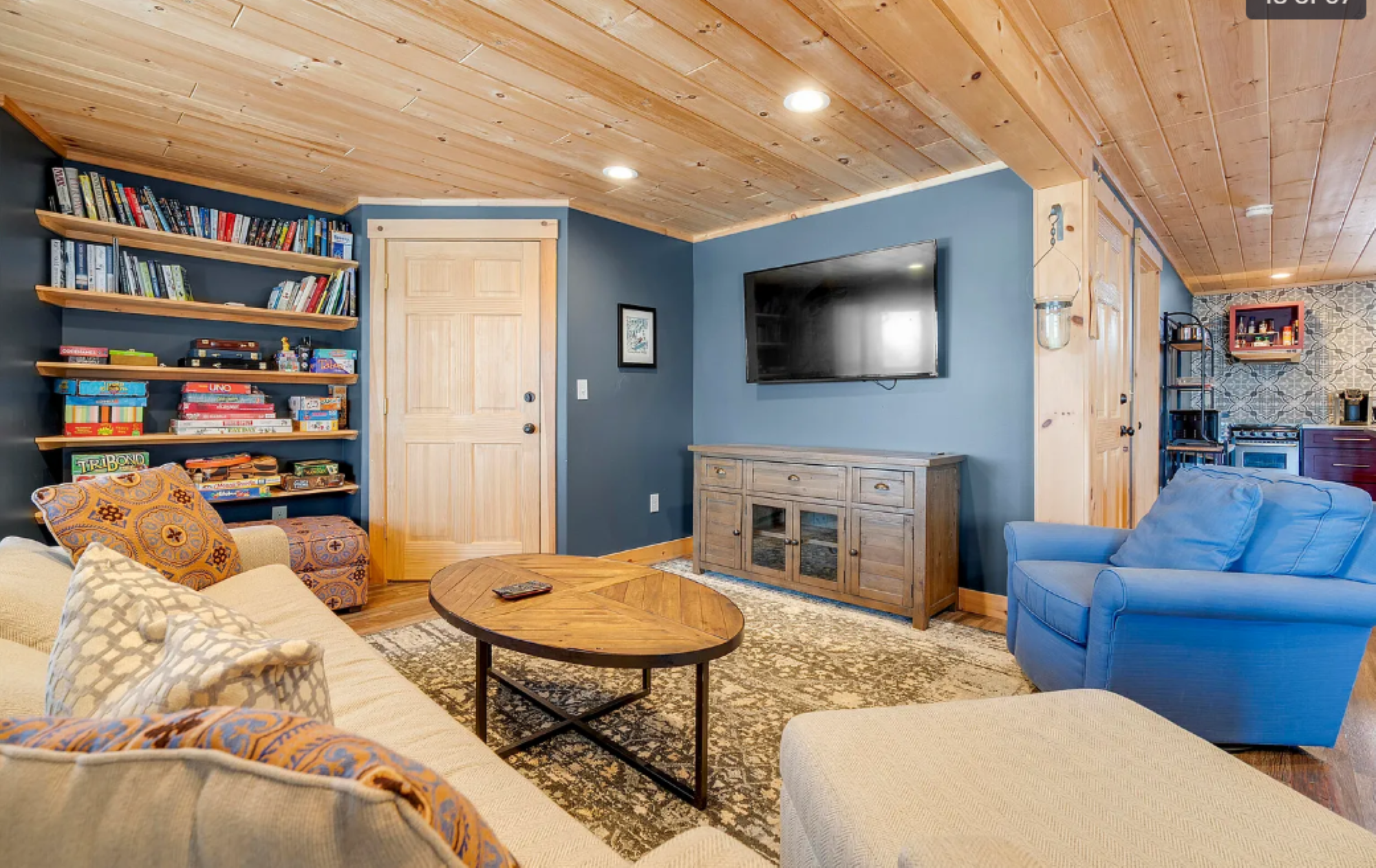 • Basement Bedroom: 1 queen bed + 2 bunk beds (4 twins), with access to a common bathroom.