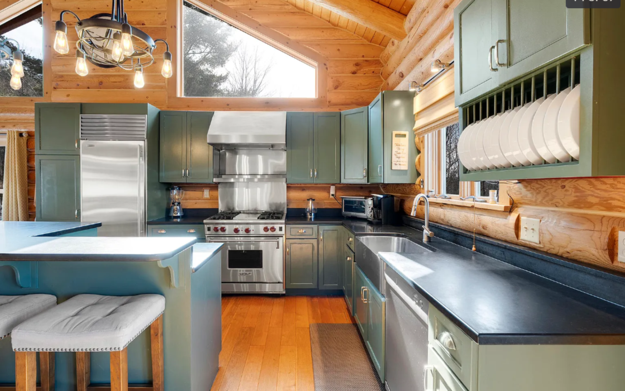 • Step into a fully equipped, modern kitchen where cooking becomes a joy. You’ll find high-end appliances, ample counter space, and a generous island that doubles as extra dining space or a gathering spot. Soapstone (or polished stone) countertops and natural light give the kitchen a bright, fresh feel.